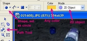 2. Select only the color circle, change Mode to 3D Round. In the Material Gallery, double click on either the provided glass preset or select one from the Ulead Glass presets (select Galleries tab in Easy Palette,and then material gallery, and glass). NOTE: Do Not Merge your image!!