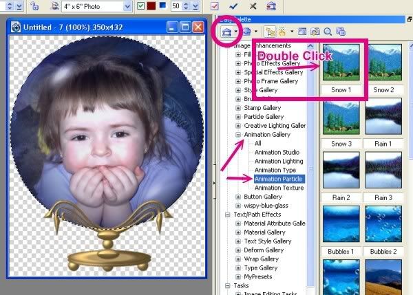 1. Highlight your image circle ONLY. Go to your GALLERIES tab and click on ANIMATION GALLERY and then ANIMATION PARTICLE.