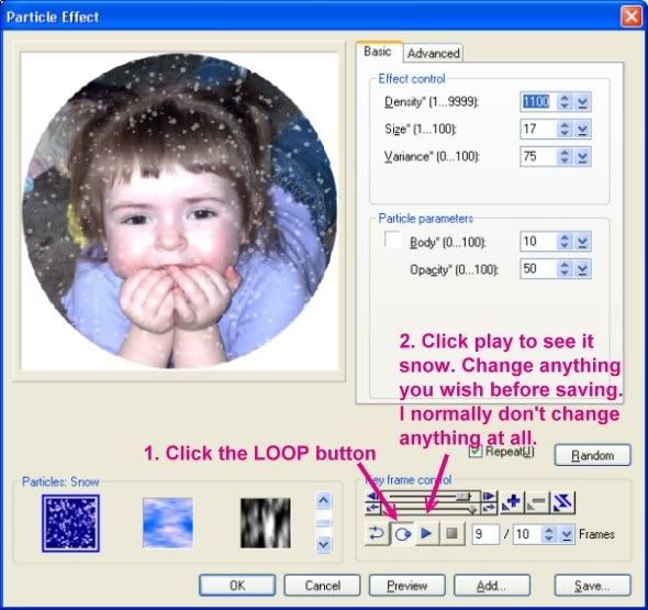 2. Click the LOOP button and then press the PLAY button. Should you want anything changed to the snow you need to do it now. You have the ability to change any of the 10 fames. You can even click the randomized button for each frame. I personally like the way Snow 1 falls all on its own so I generally change nothing.