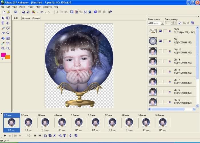 8. Open the PSD image in your gif animator. Add frames until you have 10 frames total. Adjust each frame, click the eye for all objects that should be in a particular frame. For example, frame one should only have the EYE selected on: The glass globe, the FIRST snow image, and the base. Frame two would have the globe, base and 2nd snow picture. Repeat for all 10 frames.