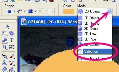 3. With remaining circle selected, go up to MODE and change to Selection. You will now have a dotted circle around your image. If you need to move it around a little more to center your image do so now. It can be moved around even in selection settings.