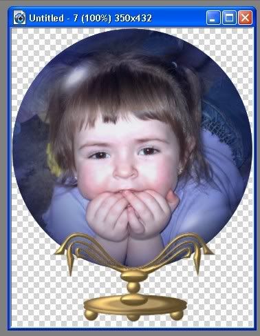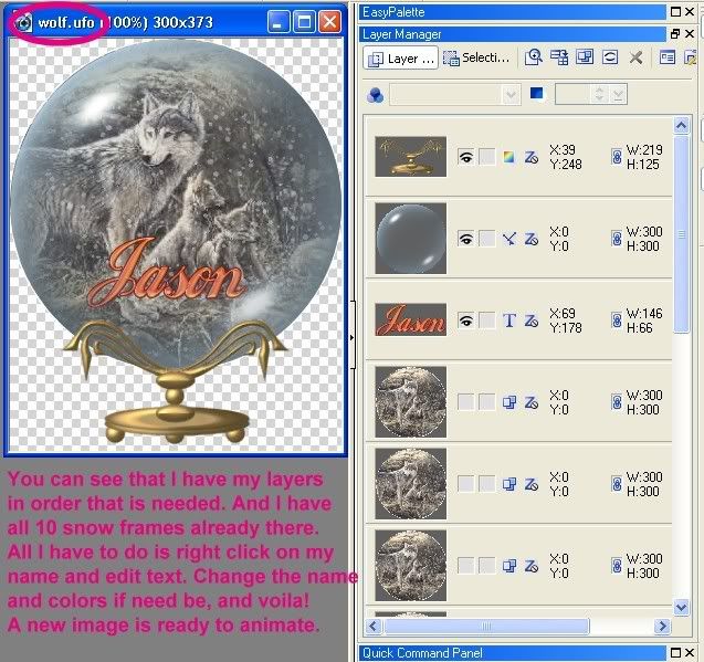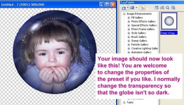 b)Or you can select all 10 snowing circles and drag them onto your original image that is still open in PhotoImpact. Be sure to CENTER BOTH with ALL circles so that its all together. You can now delete the PLAIN circle image. Be sure to adjust your layers so that the glass globe is the top layer. Go to FILE and SAVE AS and save this as a psd image.
