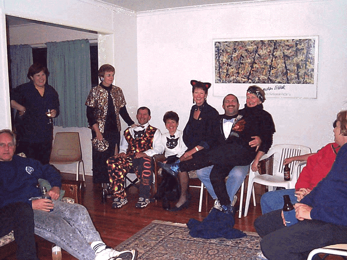 This was on the Saturday night of our camping trip to Glenbawn and we were settling down to watch the footy (exciting bunch huh?) on tellie. Now, who is in this photo? From left is Samsue (in jeans - notice the beer in hand? always a good sign), then a visitor, I can't remember her name.. (a thousand apologies), umm, then there is Strawbs in that gorgeous glittery number with matching purse, after that we have Lou and Tictac (with matching black pussies), Hotlips who was voted 'greatest hash legs' sitting upon BonkBonk, and Madame Lash also sitting on BonkBonk (I should add that by this time ol' BonkBonk was VERY much err... well, lets just say he'd consumed more than the rest of us of beer and anything else with fumes he could locate). I don't know who's seat is taken up by a stubby of beer, or who's hand is reaching for said beer. The other two people have been cut off, but I think they are Remo and Mrs Remo.