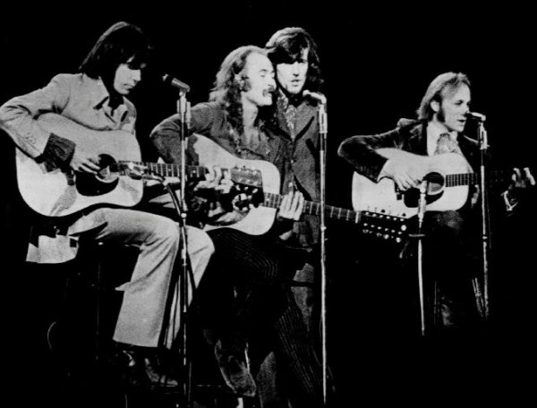 | CSNY was an American (Stephen Crosby & Stephen Stills), British (Gramham Nash) and Canadian (Neil Young) folk rock supergroup. They are noted for their intricate vocal harmonies, often tumultuous interpersonal relationships, political activism, and lasting influence on American music and culture. Originally a trio of Crosby, Stills & Nash for the recording of their first album Crosby Stills & Nash Prior to the formation of CSNY, each member of the band had belonged to another prominent group. David Crosby had performed rhythm guitar, vocals and songwriting with folk-rock group the Byrds; Stephen Stills had been a guitarist, vocalist and songwriter in the band Buffalo Springfield, which also featured Neil Young; and Graham Nash had been a guitarist, vocalist and songwriter with the Hollies, one of the British Invasion acts. All of them have been inducted into the Rock and Roll Hall of Fame at least twice. Stills and Crosby began writing songs together in 1968, after Buffalo Springfield broke up (The Byrds had already split, in 1967). Nash, who had just quit the Hollies, joined them soon thereafter and the trio performed together for the first time at the L.A. home of Cass Elliot of the Mamas and the Papas. |