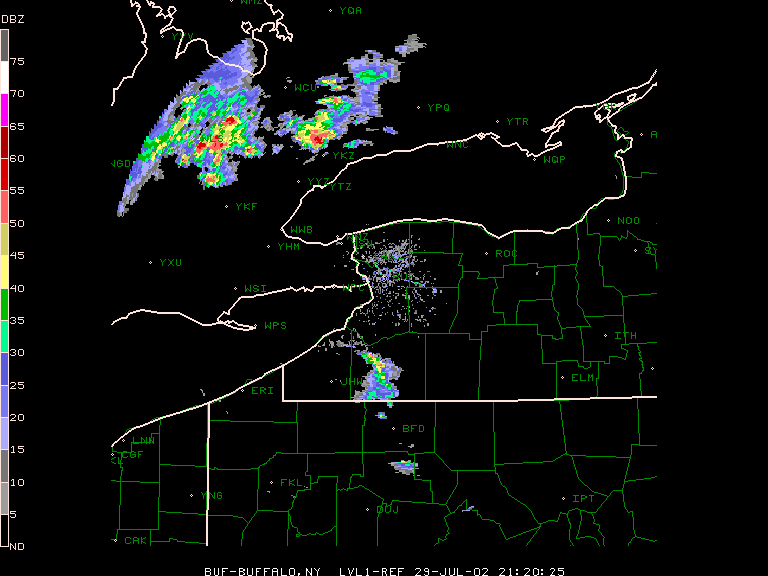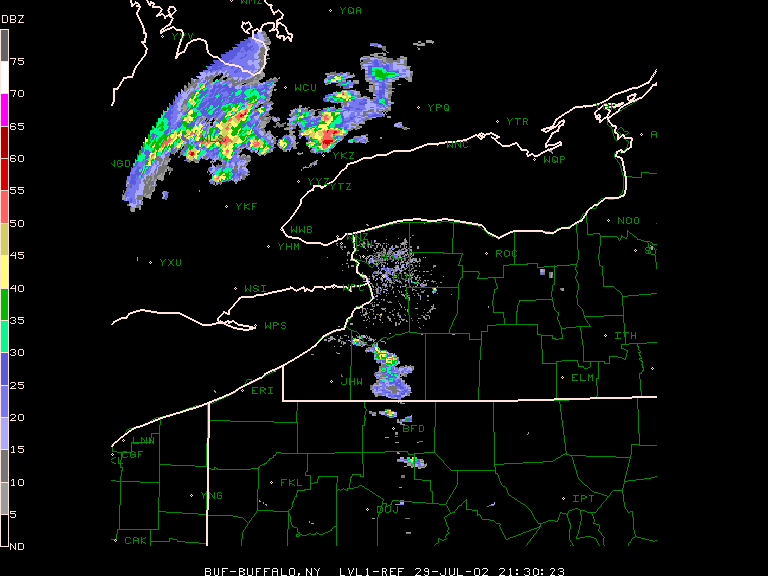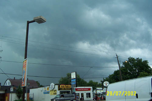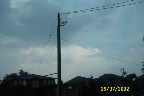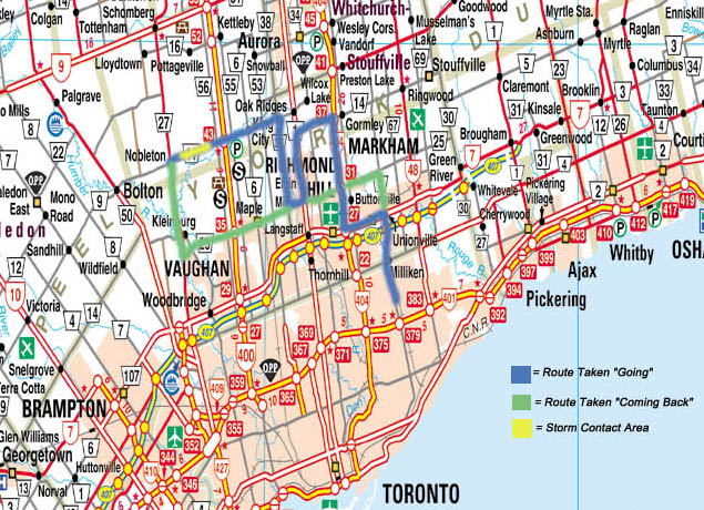 - I headed out today and had a really good chase! Things didn’t start off well; the Rogers guys down the street were fixing the cable boxes, therefore I had no real idea of what was going on out there (I have cable internet). However when I heard on TWN that a tornado warning had gone up I decided to head out. Thanks to Tom for giving me a good indication on what was going on out there:) After speaking to Tom, I decided to target the King City area. As I reached King road (Hwy 11) Things were really heating up... I drove west and once I passed the 400 I got my first real good look at this monster... not being able to get in contact with anyone (I'm guessing the regional topography/storm had knocked out my signal in the area) I stayed on hwy 11. By King City the whole sky was boiling and scud was swirling everywhere (I also noticed a very green tint to this sky). I knew this was gonna be good. The rain began just passed King City and so did the lightning. Lots of CG's everywhere, one, which I caught on my video of this chase, was no more then 200 feet away!!! As I passed the small town of Laskay I had punched the core of the storm. I wasn’t planning on doing this, since core punching is one of the most dangerous things a chaser can do. However the hilly terrain had obstructed my view of how close this cell really was. Anyway, take a carwash jet and multiply it by 10 and add some flying debris and that's what I got. Rain came down really really hard until Nobleton, where the power had been knocked out (Later analysis in the area had indicated F0 microburst damage). I pulled into the Petro Can to get gas but...of course nothing was working because of the power outage. So I headed down south looking for a gas station in service! It was at that time that I witnessed the strong rotation of this storm. I saw a half-decent looking funnel, however my need for gas unable me to continue the chase. I later figured out that this was indeed the tornadic York/Durham cell that caused tornado warnings. Yikes! After getting gas I figured I would never catch this storm since it was well ahead of me and heading at 55km/h now. So I headed home. On the way I caught some pretty nice pics of this mammoth backlight storm. This was my first real chase of the season and I must admit it was quite rewarding :) Check out my many pics and also a map of my driving track on this chase.