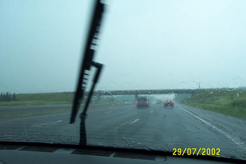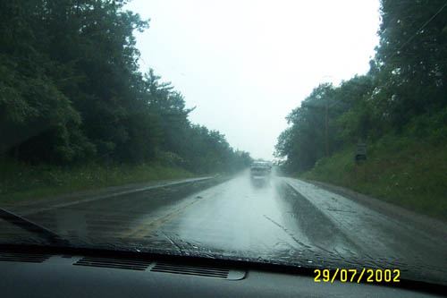 When I left home the sky was bright blue. However things quickly changed as I drove west on highway 7. I gave Tom another call and he advised me to head north. Therefore I headed up the 404, where we got brief rain.
