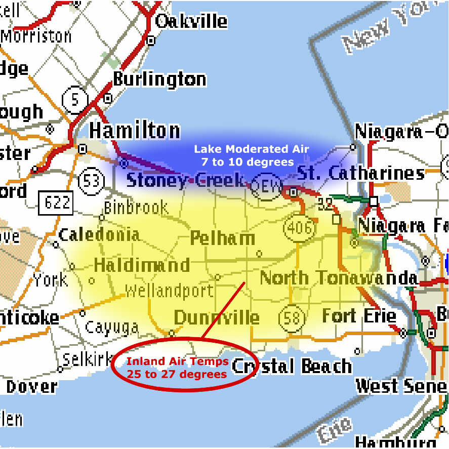 While down in the Niagara peninsula on April 20th 2003 I was shown first hand the drastic effects that our Great Lakes actually have on surrounding land masses. Following a long and cold winter and mild early spring, Lake Ontario's water temperature is taking time to heat up. Since water is such a great cold/heat absorber a large lake, such as Ontario, can greatly modify the weather around it's coastline. On warmer days the cold water in turn cools down the surface air temperature over the lake creating drastic temperature differences along its shoreline. As was the case on April 20th, where I encountered a 20 degree change in temperature over a short distance of 15 km. While traveling from Brock University (south of St. Catharines, on top of the niagara escarpment) to Stoney Creek (On the south shore of Lake Ontario, below the escarpment) temperatures dropped from 27 degrees to 7 degrees in a matter of minutes.Map showing the lake induced cool pocket of air relative to the warmer inland pocket