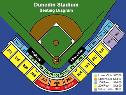 Directions to stadium (from Tampa): Take State Road 60 across Tampa Bay then turn right on McMullen Booth Road. Go to Sunset Point Road and turn left. Cross U.S. 19. When you get to Douglas Avenue, turn right. Parking is at the second stoplight. Direction to stadium (from Sarasota): I-275 North to Exit 15 (State Road 694 - Gandy/Park Blvd.). Left (West) on 694 for 1.5 miles to US 19. Right (north) on US 19 for 11 miles to Sunset Point Road. Left (west) on Sunset Pt. Rd. for 3.5 miles to Douglas Ave. Right (north) on Douglas Ave. for one mile - stadium will be on right. Direction to stadium (from Orlando): I-4 west to I-275 South. I-275 South to Tampa Airport/State Road 60 Exit. State Road 60 Across Courtney Campbell Causeway to Clearwater. State Road 60 to US 19. Right (north) on US 19 to Sunset Pt. Road (3rd traffic light). Left (west) on Sunset Pt. road for 3.5 miles to Douglas Ave. Right (north) on Douglas Ave. for one mile - stadium will be on right. Directions to stadium (from New Port Richey): Alternate 19 south to Main Street Dunedin. Left (east) on Main Street to next light (Douglas Ave.). Right (north) on Douglas Avenue for 1/2 mile - stadium willl be on left.