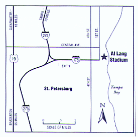 Stadium is located on the waterfront in downtown St. Petersburg, on 1st St. and 2nd Ave., 1 1/2 miles east of I-275 Exit #9.