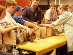 Candice Kramer judging Flemish Giants.