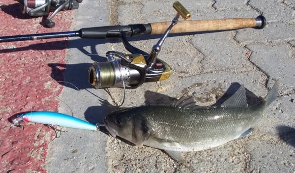 | November 26th - Sitges Harbour...and armed with half of Hindley tackle shops worth of plugs we set off down the harbour in search of the the huge Barracuda that live there. Dad went half an hour before me and as I arrived, somewhat predictably, he was already hooked into and fighting some monster fish. Was almost mission accomplished till he swung it in... a Bass...! I blanked. Laugh away... |