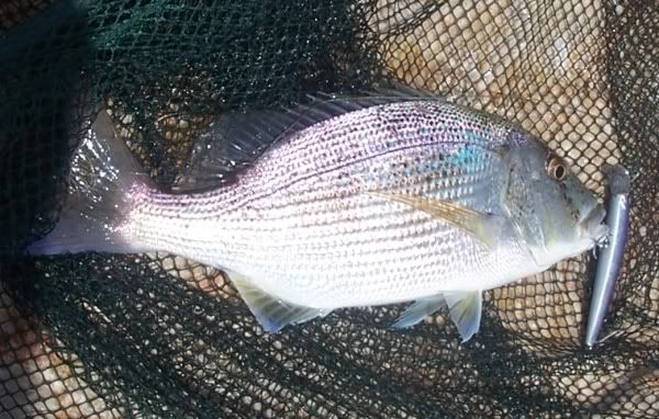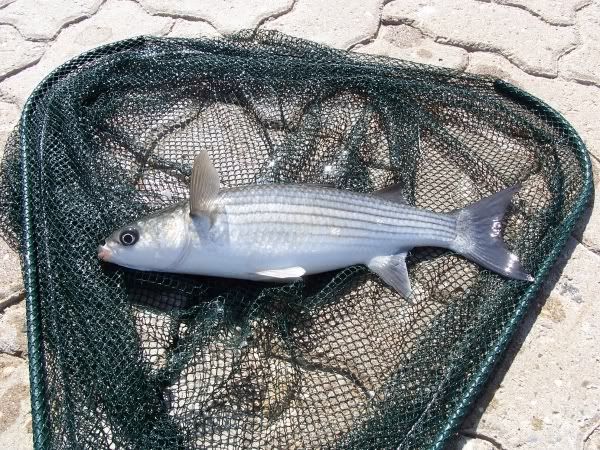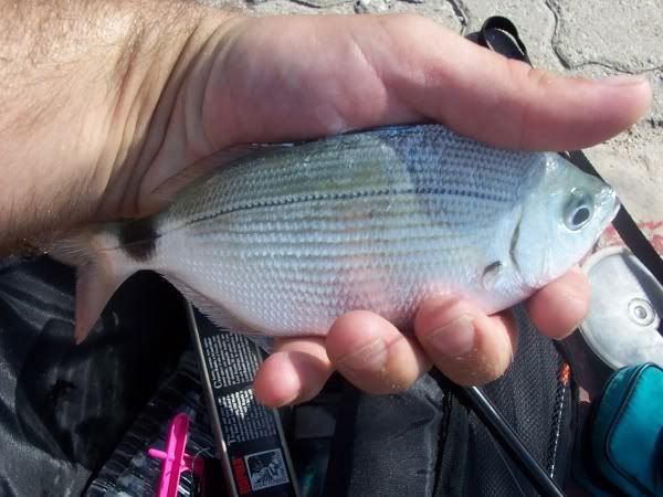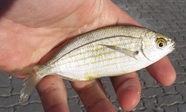 August 14th - Something Different...I hoped for as we all went down to the docks today. Wether its the temperature of the water I don't know but using small slivers of mackerel we got two of these amazing fighting silver fish. They're actually called Derbio, see here, and pound for pound these things are the hardest fighting fish I've yet come across, leaping right out of the water when hooked, and without doubt put Bass, Mackerel and Mullet and Barbel all to shame...! |