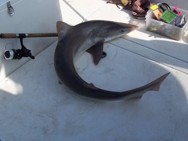 | July Summary - A Quiet month... with very few new species being caught between us, just Mullet for Dad and myself and Bass and Weaver for Mark whilst on holiday at Abersoch. Looks like all that rain has put both the fishing and fish off as a poor boat trip from Abersoch testifies. Over here I'd kill for a bit of rain but the fishing I have managed has produced some nice fish like the monster mullet from the harbour, see reports forum, and the silver, mini tuna type thing below caught on mackerel strip that performed several acrobatic leaps on it's way in. Not like a dogfish in any way whatsoever... |