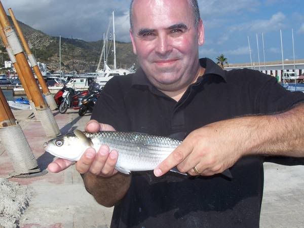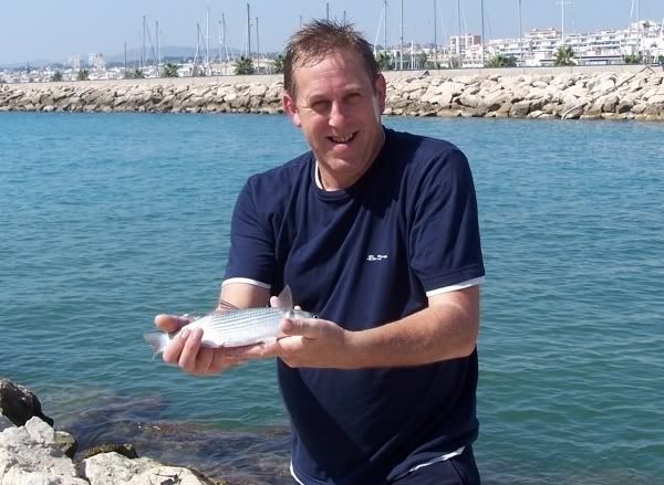 | May 22nd - Sitges Harbour... couldn't resist a little try when we were across. I know they don't count but it's a pity. Fishing with 16s hook and bread I got no mullet but did get plenty of other stuff - purpeley coloured wrasse or bream type things, silver bream type fish with a black splodge at the base of their tail and best of all a long silver, smelt like fish up to about 6" that leapt right out of the water when hooked - just like mini Tarpon..! |
