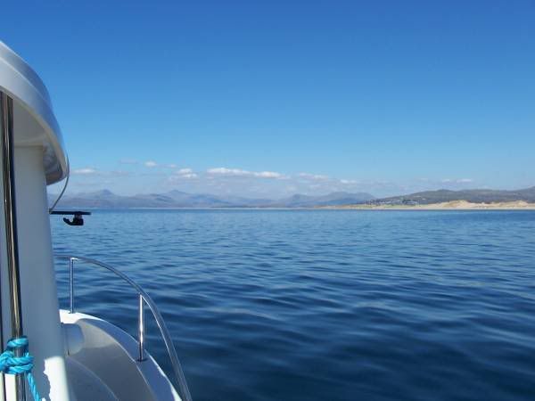 Out on the boat facing the mountains...