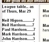 Mar 25th - Top of the league... (albeit only joint top but neverthless it's still a first) so will Neil turn out to be the Manchester United of the fishing league this year or as in previous years prove to be more like West Ham or Watford... it all depends on wether or not we really beleive what he claims to have caught - just like the Bream and Carp this weekend - doesn't it...? Hey Neil, take a look at this here. |
