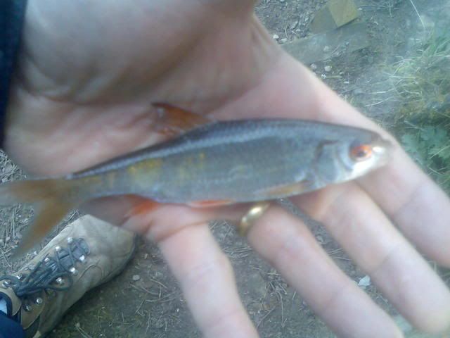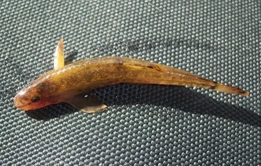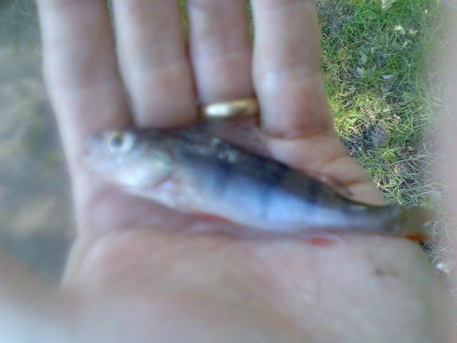 | September 24th - River Ribble... and "fishing a single maggot on tiny hooks in the expectation of Gudgeon" produced instead this tiny Stone Loach. With no hook visible in its mouth I think it might have been "paddling in the shallows, turning over stones with a kiddies fishing net" that actually caught it...more |