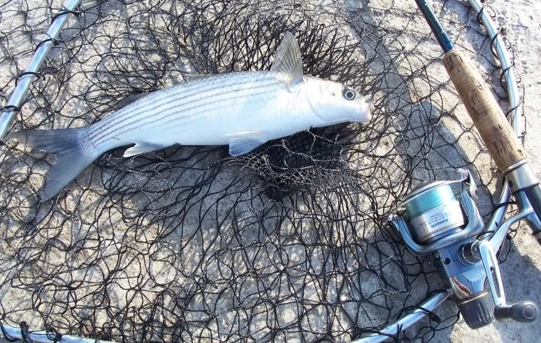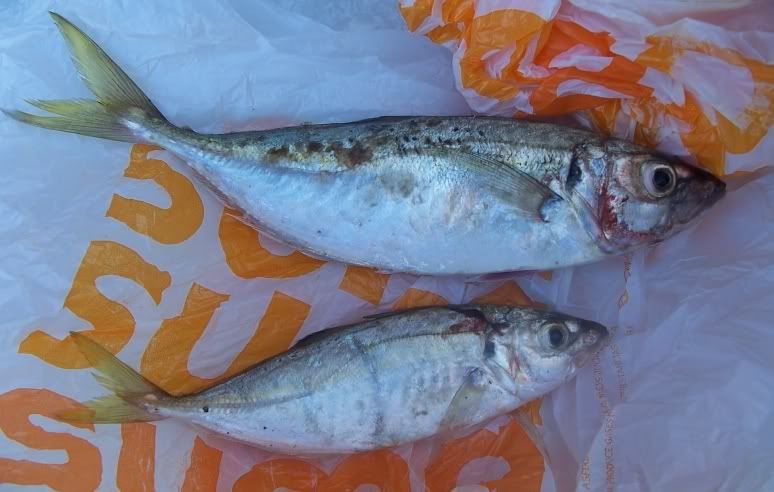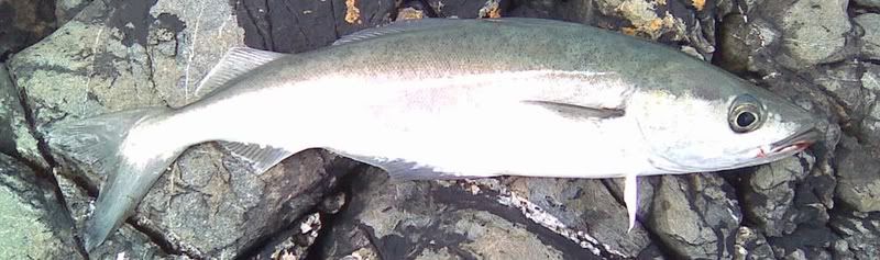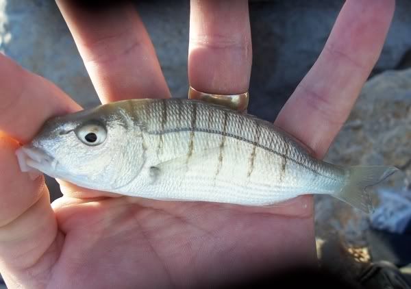 April 26th - New theory time... Seeing as I've probably already caught most of the fish down in the harbour I had a wonder down for an hour this evening in the hope that theres other fish around in the darkness. Took a while for the patented breadfeed to draw them in but soon had several takes... firstly a small Bogue, secondly a small Salpa, next something bit through the line then I got this nice Salpa on the left. Probably pulled harder than all your small Roach and Rudd combined...! | |