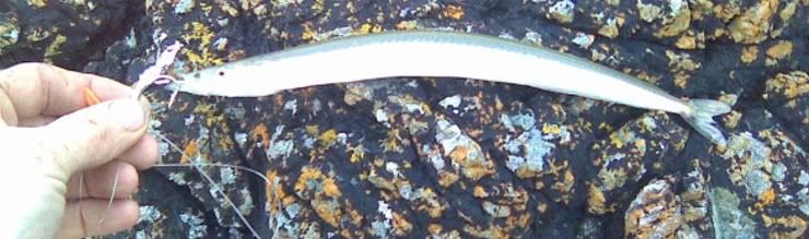 | October 14th - Sitges Calm After The Storm... and along with this small Comber who took a tiny plug close in by the rocks came the fish we were looking for all weekend - Barracuda, four of them too...! And for a change interrupting phone calls from work were a welcome distraction... with three of them I stopped winding when the phone rang only for the Barracuda to hit the lure as it paused. Same lure by the way... a purple and green Yo-Zuri Crystal Minnow now looking decidedly worse for wear..! |