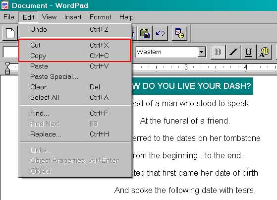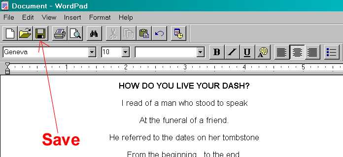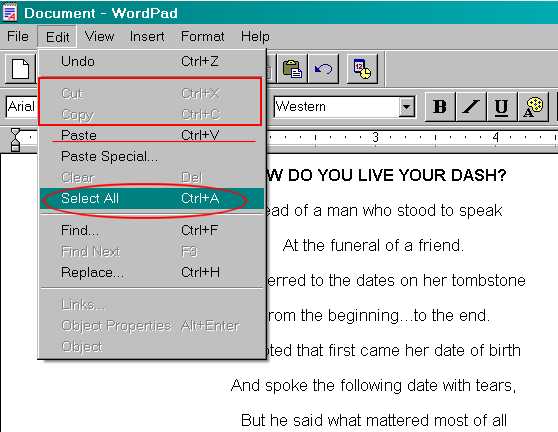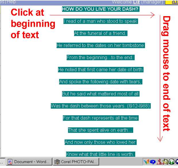 For demonstration purposes, I chosen a page from my community, StormyDay Images, called How Do You Live Your Dash. Highlight the text by clicking your mouse button at the beginning of the text and then dragging it to the right and down until you reach the end of the text portion you wish to save.