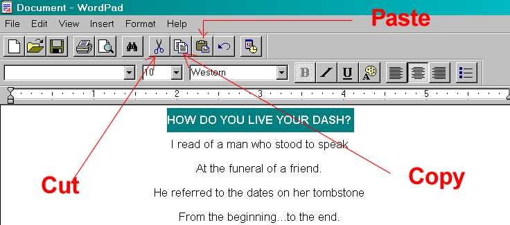 Step 3: Once you have highlighted the text, hold down the Ctrl and the C keys at the same time, and then let up on them. Go to the new document and the click on the Paste button as indicated. This will paste the text onto the document.