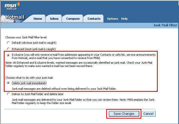 Under Junk Mail Filter, select Exclusive AND Delete junk mail immediately. Save Changes.
