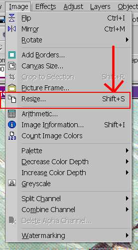 Go to "Image" on the tool bar and locate "Resize." (The "Shift+S" is the keystroke command for this function. When you get used to doing this process, you may find using the keystroke command is faster. It accomplishes the same thing.)