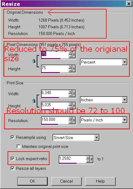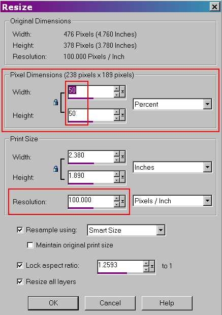 The image is still too large. I go back to the Resize Dialog box where it tells me that the image was reduced to 50% of its original size.
