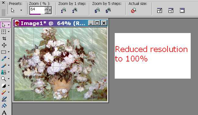 I went back to the Resize Dialog box but only changed the value of the resolution. I left the Pixel Dimension value at 75%. The image is still zoomed at 64%.