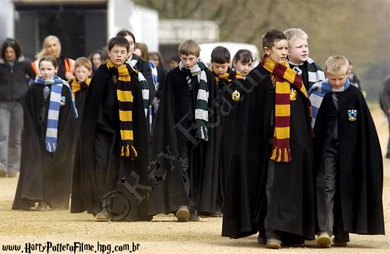 A bunch of "students" behind the set. That one kid kind of looks like a Harry... and theres another girl who looks like the female version of Neville. I want one of those scarfs, they look warm. |