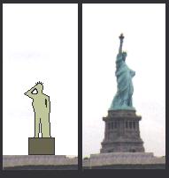 Comparing the Statue of Liberty with the Colossus: Though the bodies are the same size the Statue stands higher because of the taller pedestal and upraised torch.