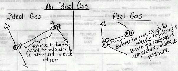 equation that provides us with the relationship between the pressure, volume, temperature, and mass of an ideal gas. An ideal gas is a gas with atoms that exist at extreme distances from each other.(1) The lack of attractive forces between atoms results in no coulombic or gravitational forces among particles, and no interactions with each other. In other words, there is no potential energy between the atoms.(3) Rather, all energy is used as kinetic energy. An ideal gas also upholds the concept that if collisions do occur between atoms, no energy is lost. Just as how the ideal machine would work, an ideal gas operates at 0% energy loss and 100% efficiency.