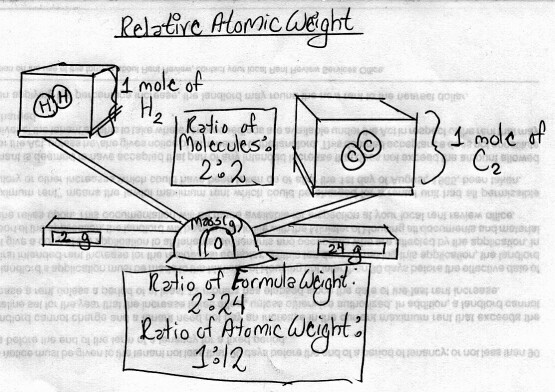 Amedeo Avogadro realized that a mole of single hydrogen atoms would weigh 1 gram. This is known as relative atomic weight. Due to the simplicity of this value, Avogadro decided to use the relative atomic weight of hydrogen (1 gram per mole) as a base to compare with all other elements on the periodic table.(2) 1 mole of Carbon-12 weighed 24 grams. Therefore, 24 grams of Carbon in ratio to 2 grams of hydrogen, after reducing to simplest form and relative atomic weight, would equal 12 grams of Carbon in ratio to 1 gram of hydrogen. In other words, the relative atomic weight of Carbon (which is postulated to exist as a diatomic molecule like hydrogen) is twelve times greater than that of hydrogen.