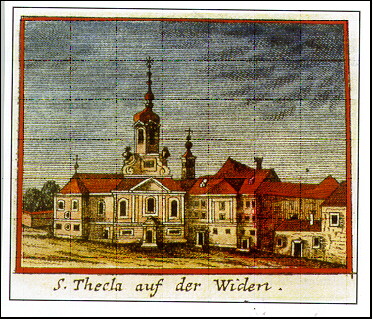 Kirche und Klostergebäude wurden nach Plänen von Matthias Gerl errichtet. Da der Bau ohne Stiftungskapitalien in Angriff genommen wurde und die ordenseigenen Mittel immer sehr beschränkt waren, ging es darum, einen bescheidenen Zweckbau zu errichten, den Gerl mit ansprechender Ästhetik zu realisieren vermochte. An der Innenausstattung der Kirche arbeiteten die Stuckateure Jakob Philipp Kegelsperger und Pietro Orsatti sowie die Steinmetzen Matthias Winkler und Franz Joseph Steinböckh. Die Altarbilder der hl. Thekla, Maria Immakulata und des Ordensstifters, des hl. Josef Calasanz, schuf Felix Ivo Leicher; von ihm stammten auch die heute zerstörten Fresken an den Giebeln von Kirche und Kollegium. Im Jahr 1756 waren Bau und Einrichtung vollendet. Die Kirchenweihe fand am 26. Sept. 1756 statt. Doch schon am 1. Oktober 1755 sind die ersten Piaristenpatres hier eingezogen, um mit ihrer Arbeit zu beginnen. Sie galt einerseits der Führung einer niederen Schule ('Normalschule'), bestimmt für die Jugend dieser Vorstadt, mit einer Anziehungskraft, die jedoch weit über die unmittelbare Umgebung hinausreichte, andererseits der Ausbildung des Ordensnachwuchses. Denn das Aufblühen des Piaristenordens in Österreich mit einer immer größer werdenden Anzahl von Mitgliedern und Niederlassungen, machten es notwendig, die Ausbildung der Novizen und Kleriker in einem eigens dafür bestimmtes Ordenshaus zu konzentrieren. DIE SCHWIERIGKEITEN FANGEN AN Die Aufgabe, ein ordenseigenes Studienzentrum zu sein, konnte das Kollegium St. Thekla allerdings nicht lange erfüllen; schon 1770 bestimmte ein Hofdekret, daß die Kleriker aller Orden ihre Studien ausschließlich an den Universitäten absolvieren dürfen, ein weiteres schrieb 1783 vor, daß die Kleriker aller Orden während ihrer Studien in einem "Generalseminar" wohnen sollten. Das Kollegium St. Thekla hatte eine wichtige Aufgabe verloren. Ein Teil des Klosters mußte über staatliche Anordnung verkauft werden.