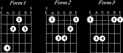 Notice that the roots of forms 1 and 2 are on the 5th string and the root of form 3 is on the 6th string. X's indicate strings should not be played, and the number over the fret indicates the fret number. The numbers in the black dots indicate which finger to use. The dotted line in the chord form diagrams running between dots that have the same finger numbers shows that you should bar the indicated finger (usually your 1st finger) across all the necessary strings.
