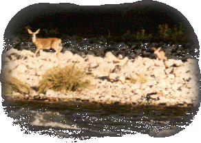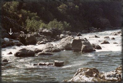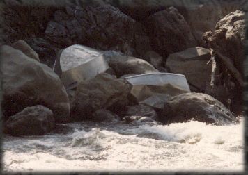 | because we entered river left but missed the immediate pull right to river center. Rob skipped an oar (instead of the oar going in the water on the stroke, it came up and skipped across the top of the water). One skipped oar and that was all it took. It was either a collision with this huge rock and certain doom or power forward and try to perch in a forward position on the "Picket Fence". Rob had about a split second to make this choice. He chose the fence, we were just about to it and I looked at the boats on the bank which were now less than ten feet from us. I recall thinking.... this is probably what they did and didn't make it. The second we were about to perch on the fence the current being so strong, turned us broadside to the fence....... this was a bad thing as if things weren't bad enough. Whether rafting or in drift boats, when you hit a rock sideways the thing to do is to lean or shift your weight to the "rock side" of the boat. It's not the rock that does you in but the rock stopping you and the up river current pulling the up river side of the boat under. We both went rock side when we hit the fence.... ok another confession... I was at the rock side of the boat because I was on my way out, I was abandoning ship. Rob stopped me mainly because he needed the weight there. I remember looking back at the up river side of the boat and seeing water rushing near the top of the gunwale of the boat, within inches of coming in. |