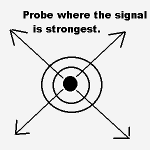 One key to success in recovering a coin without damaging a lawn lies in your ability to precisely locate, "pinpoint" the object that your detector has located. The better pinpointing detectors have an all-metal, no-motion mode. Switch to the all-metal mode and move the search coil until you hear the strongest signal. The target should be directly under the center of the search coil. As deep coins are usually easier to pinpoint than shallow coins, one pinpointing trick is to convince your detector that the target is small and deep. For detectors with a detune feature, simply hold the coil over the target and hit the detune trigger. The signal should decrease to a weak signal centered directly under the center of the coil. Take your probe and stick it in the ground at that point. For detectors without a detune feature, raise the coil until you can barely hear the target. Again, the target should be directly under the center of the search coil.