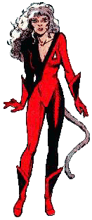 Powers/abilities:Has a humanoid-feline appearance with the ability to transform into a large purple cat. In humanoid form has similar appearance-long purple hair, violet eyes, sharp naturally pointed nails and tail. While in feline form she was extremely agile and could even climb walls.