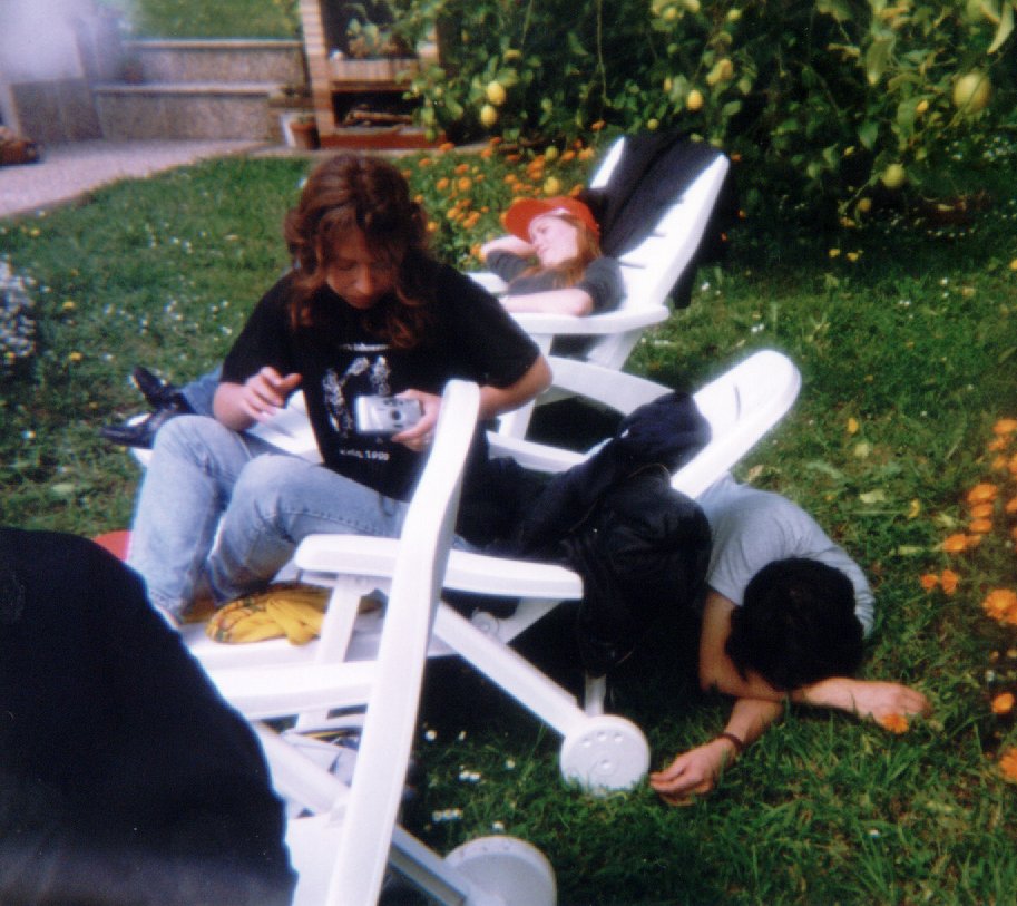 Lasmallen se prepara para hacer una foto mientras Cambragol duermen en la hierba. Al fondo, Nienna toma el sol