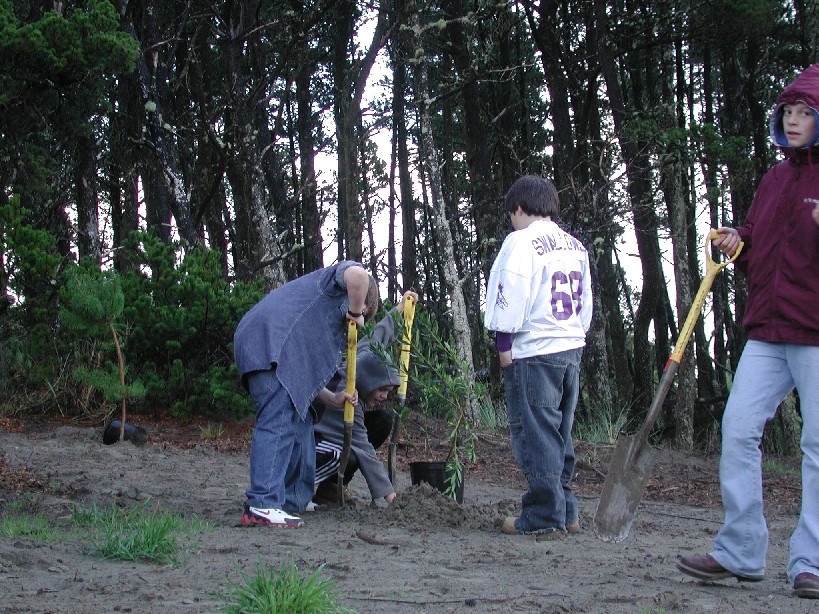 ReTree has honored Frank's dream both on November 12, 2004, and now on October 28 of 2005 by holding tree plantings at Fort Clatsop's Netul Landing and at Sunset Beach along the Fort-to-Sea Trail. Almost 2200 native trees and shrubs were planted by 5th and 6th grade students from Lewis and Clark Elementary School and Warrenton Grade School over the last two years. Included in the programs was a brief environmental education presentation put on by the park staff which focused on subjects submitted by the students prior to the plant, relating to planting trees, local natural resource issues, and the Lewis and Clark expedition. Nancy Eid, one of the Park's resource managers, reminded the students of the vegetation that Lewis and Clark would have seen and written about nearly two centuries ago. “Those are the very shrubs and trees that you’re going to be planting today.” The plants also gave the students an opportunity to participate in a useful community service learning project. We think that Frank would have been very happy to see us take part in the "shindig".