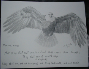 I finished the drawing of the Eagle for my Grandma a couple days ago. I think it turned out pretty well. There were lots of delays and interruptions while making, which is why it took so long. I hope she likes it. Here is a digital image of the drawing (reduced size and resolution in hopes that it will load faster) in case anyone might be interested in seeing it.