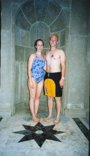 We managed to get a nice photo of us standing under a sort of temple near the pool. The floor is all marble but I didn't get yelled at here. |