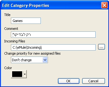 ניתן להשתמש בספריה נוספת לספריית ברירת המחדל של ה-eMule כדי להעביר אליה את הקבצים שהורדתם הסתיימה בקטגוריה זו. אם תשאירו שורה זו ריקה ה-eMule תשתמש בספריית ברירת המחדל לקבצים שהורדתם הושלמה (Incoming Files).