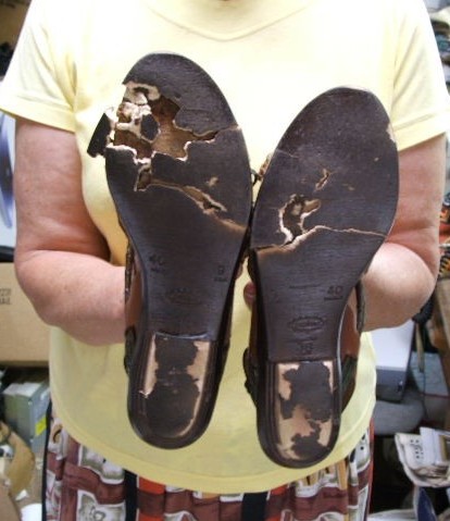 One has to wonder at the hide of some shoe manufacturers. The shoes you see were worn by my wife for about one hour. Although they were purchased some twelve months prior to use (don't ask, my wife is one of those totally inexplicable beings - a woman) and, because they were a little tight, she wore them for an evening at home and then put them back in their (environmentally friendly) box to, presumably, cogitate upon their attributes. So, today she decided to resurrect them and wear them to the local shopping centre. This exercise involves a twelve minute walk to the local railway station, a few minutes sitting and then about thirty or forty minutes ambling around the streets of this hive of commercial activity. Obviously the train ride and short walk are then repeated in reverse order. One has to wonder whether those who make these abominations have a soul. The path taken by this angel was paved, not with gold but (apart from the odd hill) relatively even. Whilst she is no sugar plum fairy she is surely no break dancer. I implore fellow shoe wearers to unite; join me in my crusade to bring to task these heels who have proven themselves to be purveyors of pitiful pedestrian pads. Let us unite and have a shoe free year! Do not let them bring us to our knees! Let us gird our loins and not our feet whilst we fight these callous moguls. Walkers of the world unite! Sorry if the above seems a little corny but in this fight for freedom we do need thick skins. Once more unto the breach, dear friends, once more; Or close up ... or have I said this before somewhere? |