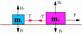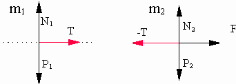 Eje x: T = m1 . a * Eje x: F – T = m2 . a *