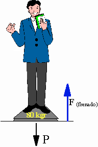 En el momento en que empieza a frenar el sistema, el cuerpo tiende a seguir en movimiento ya que frena el ascensor pero no la persona (principio de inercia). La fuerza supuesta "impulsora" del hombre está determinada por su masa y la aceleración de frenado. Este fenómeno se percibe en la balanza "pareciendo" que la persona "pesa" menos, siendo el valor que aparece en el aparato la "resta" entre ambas fuerzas.