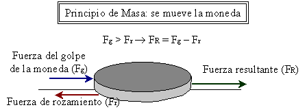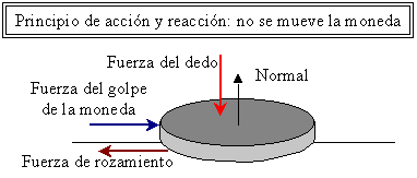 Si aplicamos una fuerza de costado (cuando la moneda choca la que tu sostienes), la moneda que está bajo tu dedo no se moverá debido a la acción de fuerza de rozamiento que hay entre la moneda; tu dedo y la superficie de la mesa (hay una fuerza de rozamiento en cada cara de la moneda) este fenómeno es explicado por el principio de acción y reacción. Pero la otra moneda, la que está libre puede moverse pues no hay fuerza que se oponga (el rozamiento entre la moneda y la superficie de la mesa no es suficiente).