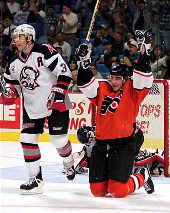 Three seasons, three fifty goal seasons. The Flyers aquired left winger John Leclair from the Montreal Canadiens along with defensemen Eric Desjardins for right winger Mark Recchi. Upon coming to the Flyers, Leclair was tried on the left side on a line with Eric Lindros and Mikael Renberg. The line immediatly clicked. Leclair netted twenty six goals in his partial season as a Flyer. The line devesated apposing defenses. The line was so big and strong, and cycled the puck so well, that the other team's defensemen had trouble staying with the Lindros line. And even when they did get the puck, they had a couple of bodies to get it past to clear the zone, and a lot of the times they would be stripped of the puck and the Flyers were cycling again. The line was dominating down low, espcially against small defensemen, and this started a real push for larger defensemen who could physically handle this line. The line then got the name it was famous for from current Philadelphia Phantom Jim Montgomery: The Legion of Doom. Leclair and Lindros and Renberg went on to be the best line in the NHL until Renberg was traded to the Tampa Bay Lightning with defensemen Karl Dykhuis for center Chris Gratton. During Renberg's absence, Leclair went on to another fifty goal year, with many people going threw the revolving door on the right side of his line. But during the 1998-99 season, an apparnt solution to this problem was found. That came in when the Flyers traded Shjon Poedin to the Colorado Avalanche for Keith Jones. For the first time since Renberg's departure, the Lindros line was dominate as a line, not just dominate as Leclair and Lindros. There cycling came back and Jones could cycle with the big boys. But then another player was obtained who might take Jones place on the top line. The player was Mikael Renberg. He was re-aquired by the Flyers with Daymond Langkow for Chris Gratton and Mike Sillinger. But the Legion of Doom was not reunited, because Jones was doing a good job with the top line. Leclair is again on pace for another fifty goal season, and he is the only one on pace for fifty goals this year. |