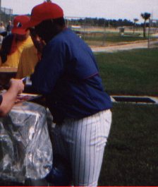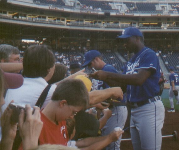 Tino Martinez signs outside dugout on overcast night after BP 2003.