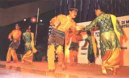 TARIAN ZAPIN - This dance was brought to Malaya by the Muslim missionaries from Arabia during the fifteenth century and in the traditional ways of the Arabs, only males performed it. The movements are simple and dignified with the accompaniment of the flute (gambus), gypsy type bongos (marwas) and the violin. The dance is usually performed in a pair or many pairs.